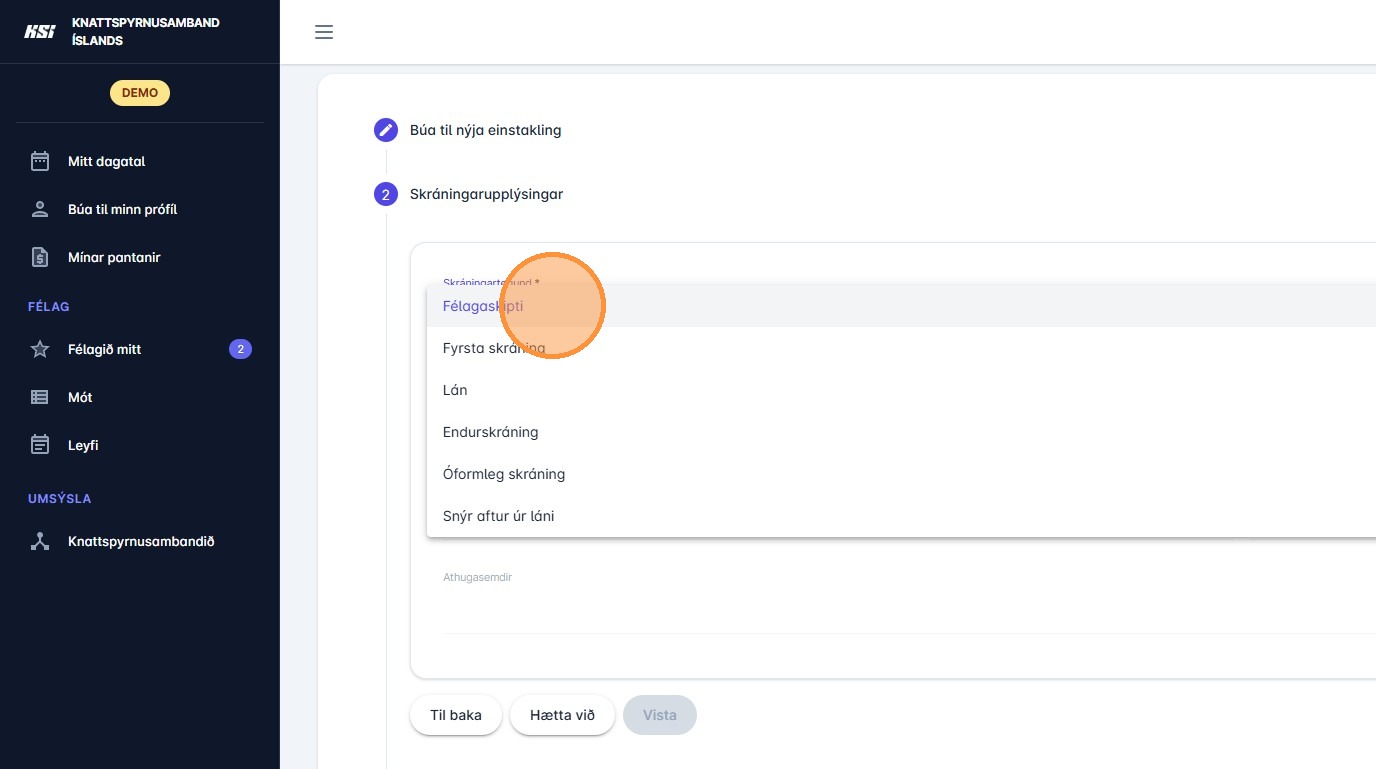 8. Veldu "Félagaskipti" eða "Lán" eftir því hvort á við.