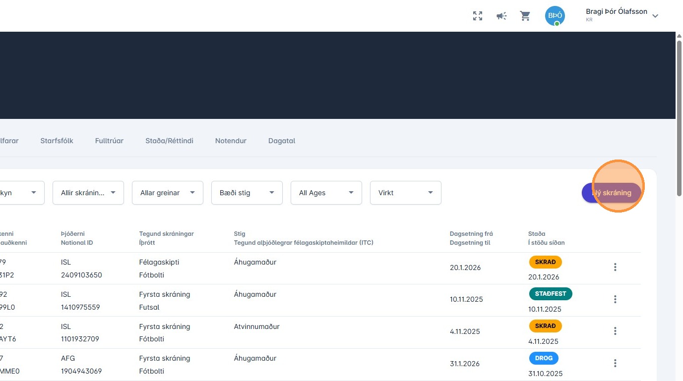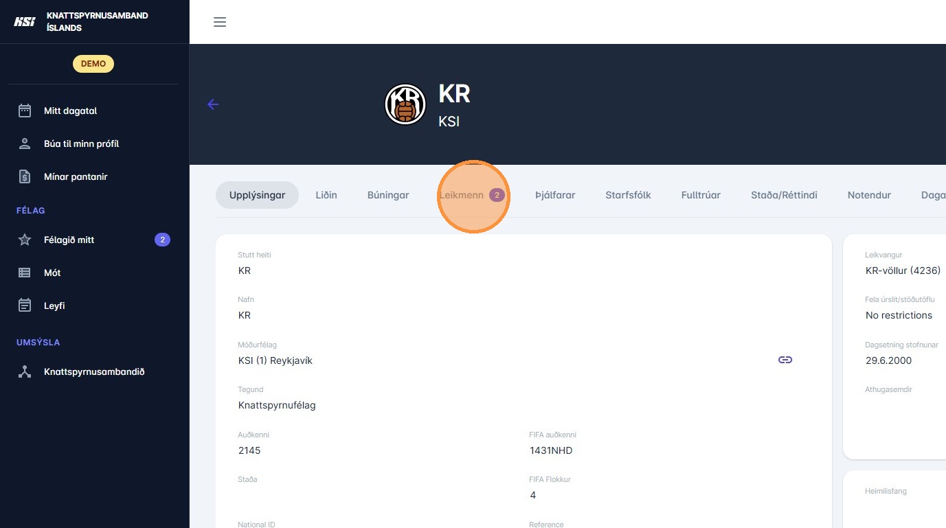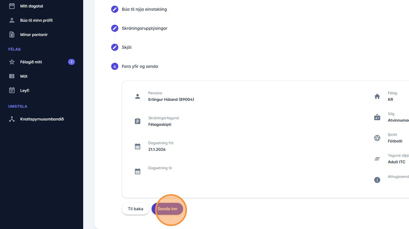 6. Fylltu inn í reitina. Settu inn fyrstu sex stafina í kennitölu (fæðingardagur og ár) fyrir erlendan leikmann sem ekki er kominn með kennitölu þegar skráningin er gerð.