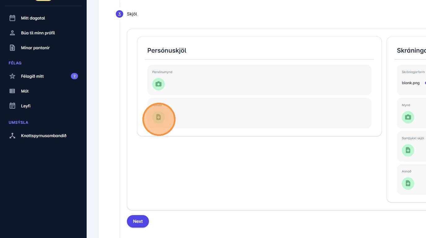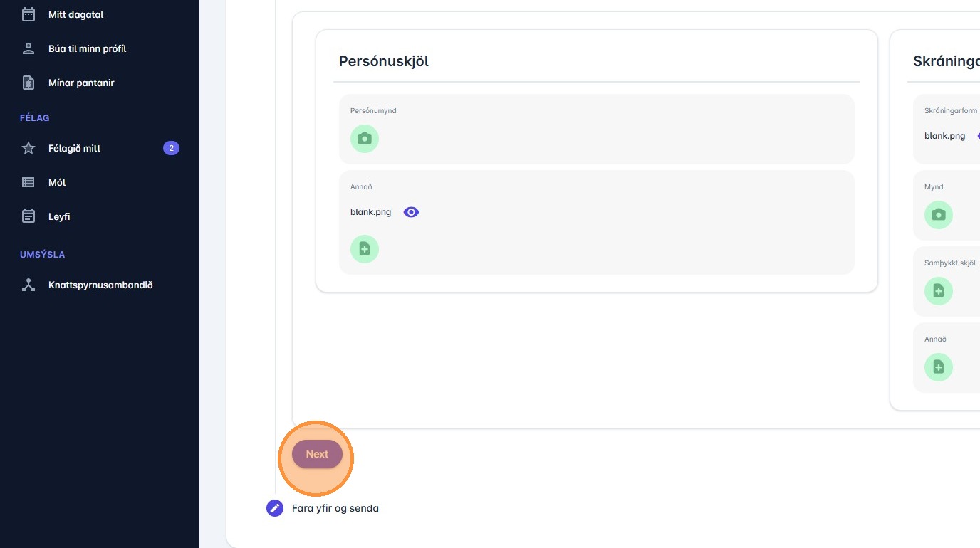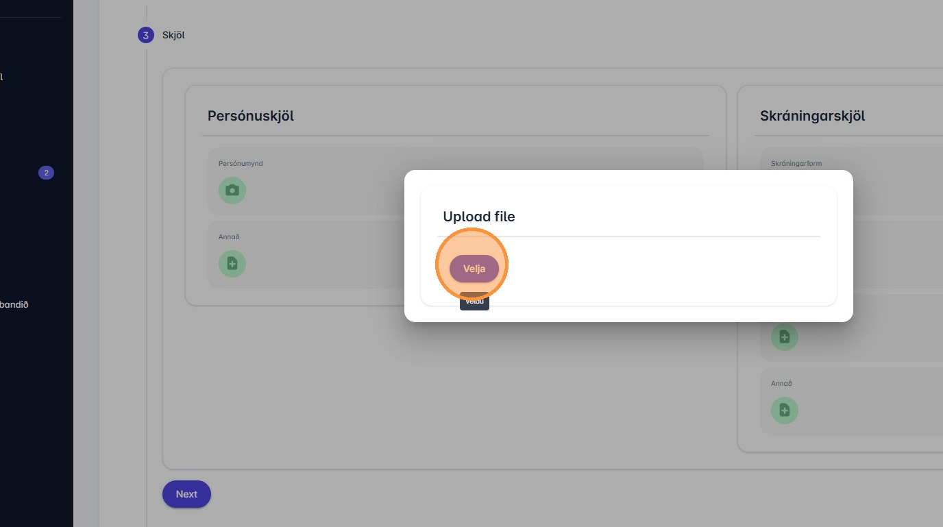 15. Smelltu á "Velja" og settu inn undirritað samþykki leikmanns fyrir félagaskiptum. Skjöl varðandi félagaskipti og frekari upplýsingar má finna hér: https://www.ksi.is/felagslid/felagaskipti-og-samningar/