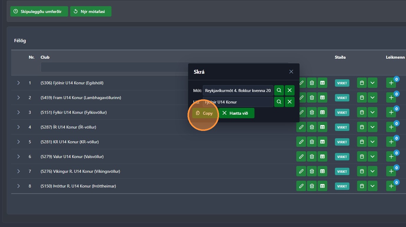 5. Veldu virkt mót sem þú vilt afrita leikmannalista úr.