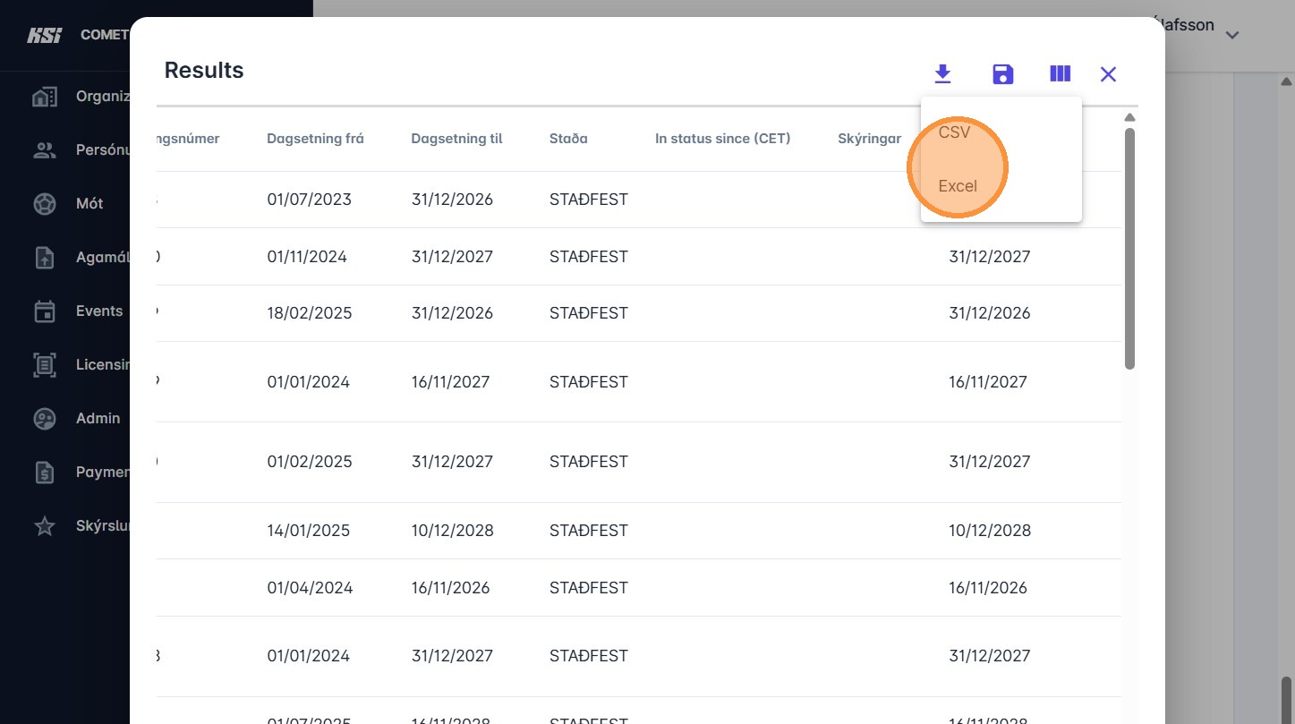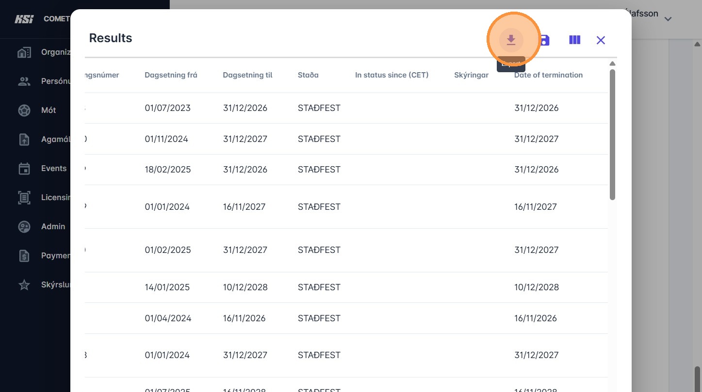 10. Nú sérðu alla leikmenn sem eru á þessum tímapunkti með samning í stöðunni 'Staðfest'. Smelltu á "download" til að hala niður gögnunum